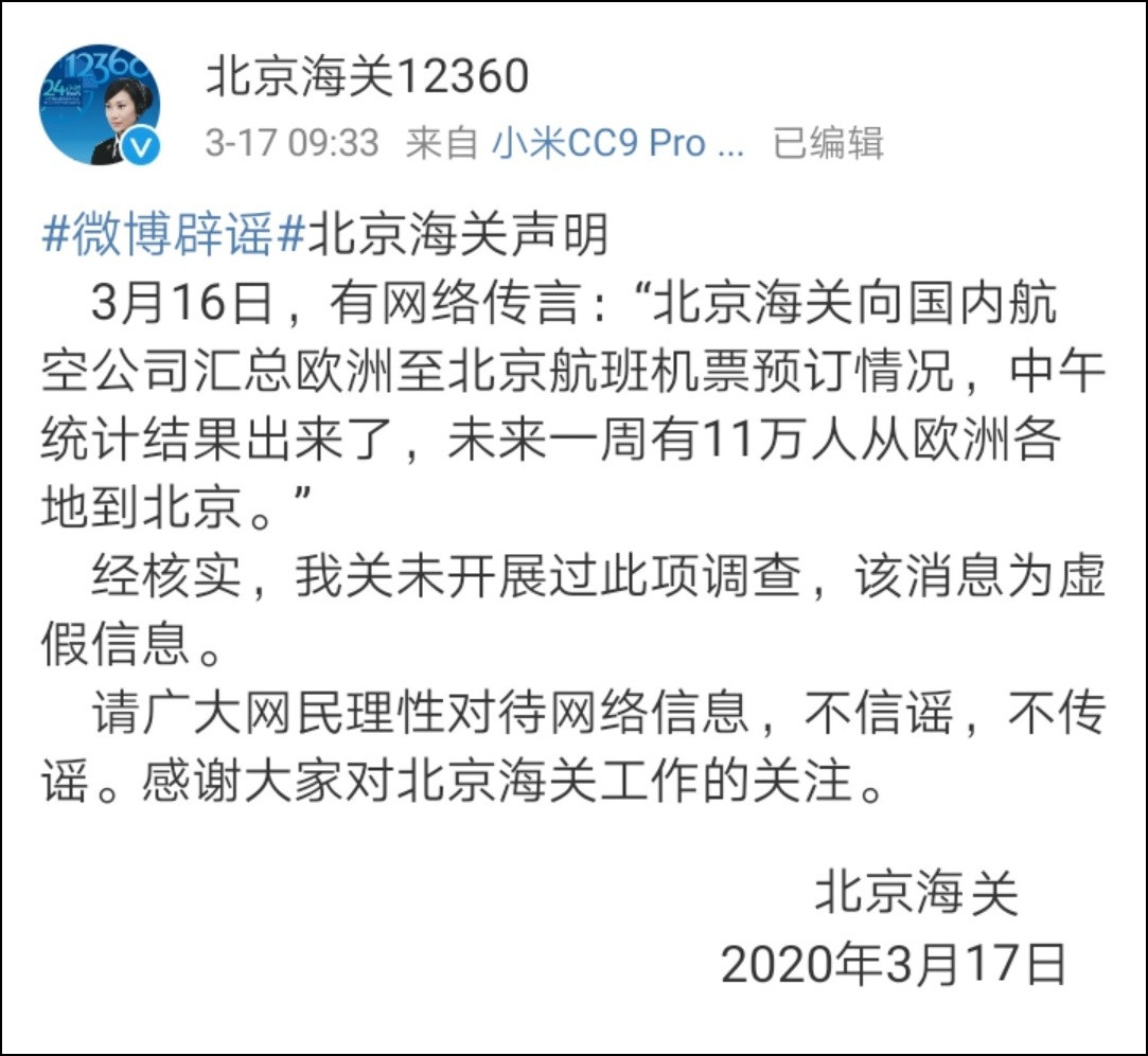 今天上午,北京海關已經針對“未來一週有11萬人從歐洲返回北京”的謠言做出澄清,強調他們從未做過類似調查。