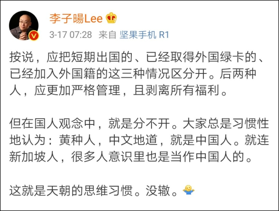 要嚴格區分短期出國(包括旅遊、遊學、短期交換等)、長期旅居海外但仍保留有國籍的、已經徹底移民脱離了中國籍的這三種情況。根據不同的情況,可以在回國這件事情上設置不同的門檻,包括後續的隔離與治療也是如此。