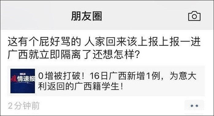 像是今天上午廣西衞健委通報,連續多日無新增病例的紀錄被打破,源於一位在意大利留學的廣西籍學生回國後確診。