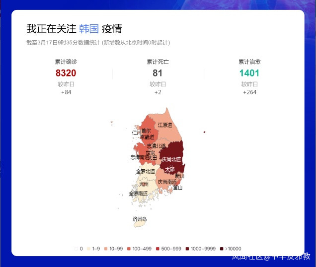 截至3月17日9時,韓國已確診新冠肺炎(COVID-19)8320例,其中大邱市累計確診6098例。為應對日益嚴重的疫情,韓國15日將大邱市和慶尚北道劃為特別災區。19日起對所有旅客實施入境管制。