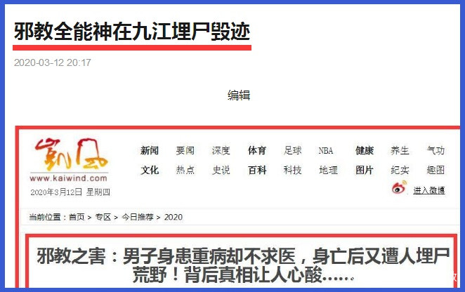 2月初,中國江西省九江市警方偵破一起邪教全能神埋屍滅跡案。江西撫州籍全能神人員患病,該邪教不送醫治療,死亡後不報告政府主管部門不通知家屬,直接挖坑埋掉。
