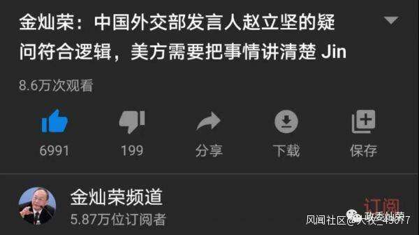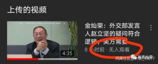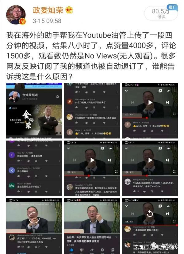 政委工作室的海外成員在YouTube(油管)政委的官方頻道上傳了一段四分鐘的視頻,題為金燦榮:趙立堅的疑問是符合邏輯的,美方必須説清楚。結果過了八個小時,該視頻的點贊數4000多,評論數已經1500多,觀看數卻一直是0(No Views)今天,政委在youtube遇到一件怪事……