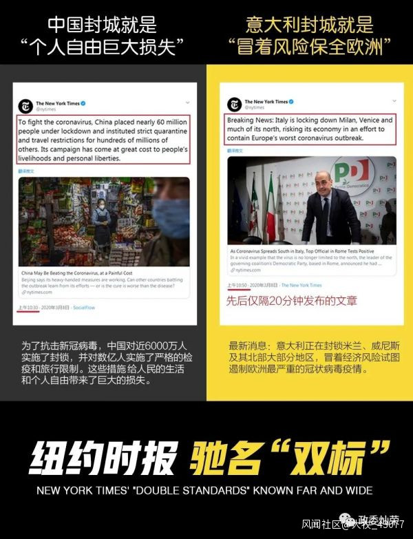 顯然,“紐約時報”正屬於此類媒體,3月8“紐約時報”曾發佈兩條新聞來評判中、意兩國的同一行為——“封城”。其中意大利“封城”被“紐約時報”盛讚為“冒着犧牲經濟的風險,遏制了新冠病毒的擴散”,而對中國“封城”“紐約時報”則評價為“給人民的生活和自由帶來了巨大的損失”。