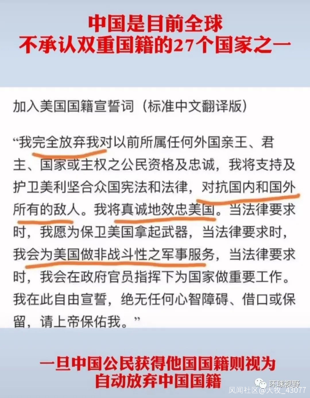不過,對於那些擅於鑽營,想來曾中國“免費治療”的人,甚至背棄了中國的人,雖然中國的懷抱很大,但作者個人的意見是不太歡迎這類人。疫情當下,國外形勢急劇惡化,必定會有很多擅長投機鑽營的人回中國避難。還有,國外治療得不到保障不説,新冠治療費用也是動則幾萬幾十萬甚至上百萬,必定會有很多人會來蹭中國的“免費治療”。説實話,當你在放棄中國國籍的那一刻,也就意味着你已經下定決心要與這個國家劃清界限,再無瓜葛,我們也就沒有了繼續保護你的義務。當你在加入別國國籍的時候、當你宣佈效忠別國的時候,應該保護你的是你所效忠的那個國家,而不是中國。