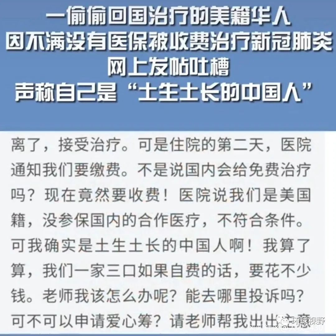 (視頻截圖)一般來説,一個政策的出台常會伴隨不理解的聲音,但這兩項政策卻獲得了一邊倒的支持聲。原因為何?作者認為主要有兩點:一是人們對崇洋媚外以及放棄自己祖國的厭惡。由於各種原因,從過去到現在,不少國人還沒完全結束“崇洋媚外”的習性,這讓人們為之不屑,特別是一些加入外國國籍的人,也讓不少國人覺得這是一種背叛。正是這些原因,讓人們覺得,我們沒有理由再為一個“外國人”免費治療。正如網絡很火的那句話“家鄉建設你不搞,千里投毒你第一”。二是不希望對我們造成更大的抗疫風險與抗疫期限。若是我們對“非中國公民”進行無差別的免費治療,必然會讓中國成為全球“免費治療中心”,當大量感染者湧入,這必然會加大我們的風險與抗疫期限,這顯然是我們不樂意的。事實上,此前的一些案例已經出現了種種不悦。比如,最為著名的就是已經加入美國國籍的一家三口,採用違規手段偷跑回中國想得到免費治療(最新消息,已被立案。)網上流傳,因為他們已不是中國公民而無法享受這一福利,當被醫院收費時便大倒苦水,稱自己是“土生土長的中國人”,還要投訴!