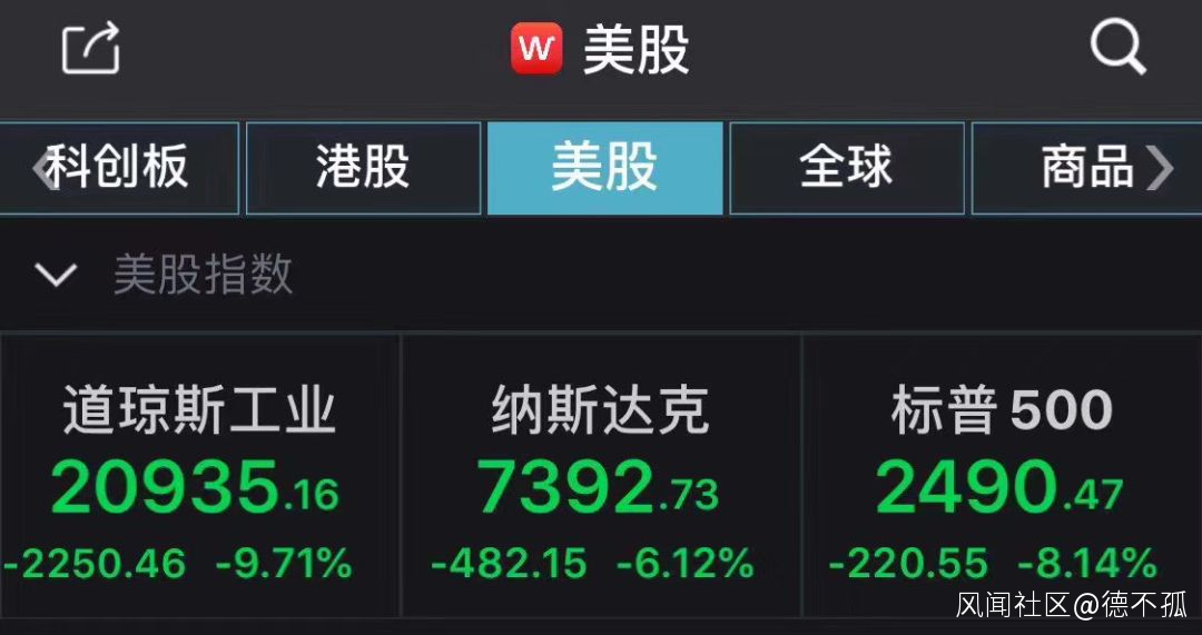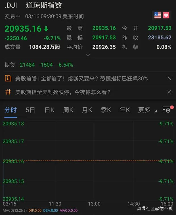 納斯達克指數開盤下跌482.15點,跌幅6.12%;道瓊斯指數開盤下跌2250.46點,跌幅9.71%。