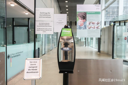 資料圖片:這是3月9日在德國首都柏林聯邦政府新聞和信息局入口處拍攝的消毒潔手器及衞生安全告示。新華社記者 單宇琦 攝