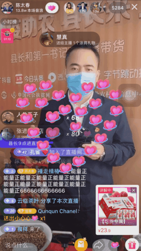 縣長做直播的新鮮反差,讓其他跟我一樣懷着好奇心的人,留在了直播間裏。聽他介紹東北特產,帶貨的陣勢一點都不輸網紅,墨鏡、愛心、鮮花,禮物也唰唰唰的蓋在了縣長的臉上。