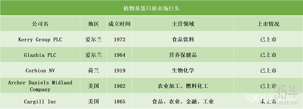 從食品飲料、生物化學到農業加工,植物基蛋白質產品可以運用於多個場景。目前,植物基蛋白質市場的主要競爭者包括Kerry Group PLC(凱利集團)、Glanbia PLC(格蘭比亞)、Corbion(科比恩)NV、Archer Daniels Midland Company (阿徹·丹尼爾斯·米德蘭)和Cargill Inc(嘉吉)全球5大公司。