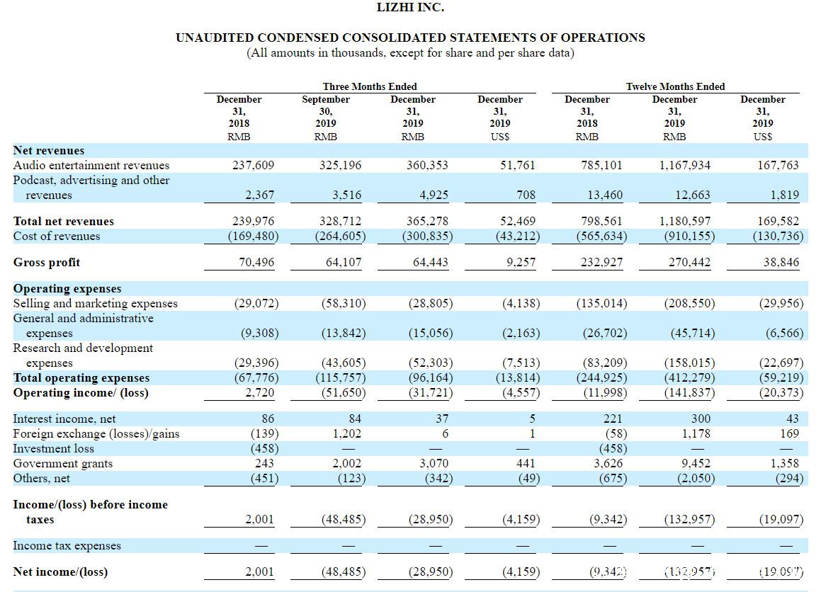 2020年3月12日,頭頂“中國在線音頻第一股”之稱的荔枝發佈2019年財報顯示,荔枝第四季度收入為3.65億人民幣,同比增長52.08%;淨虧損3.03億元,而2018年同期為5850萬元,同比增長417%。2019財年收入11.86億元,同比增長47.8%;淨虧損10.73億元,而2018年同期為2.26億元,同比增長374%。