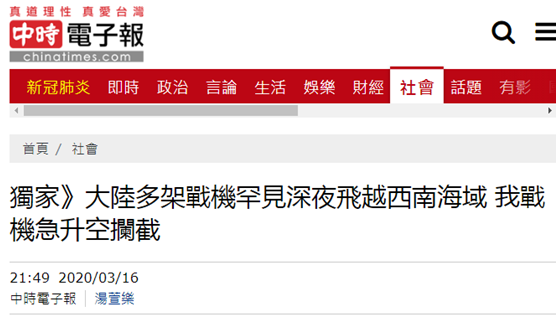對於大陸軍機今晚出現在台灣西南空域,“中時電子報”稱,台空軍暫時沒有評論。