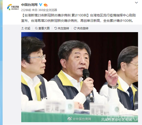 台灣地區流行疫情指揮中心剛剛宣佈,台灣再增23例新冠肺炎確診病例,再創單日新高,全台累計確診100例。