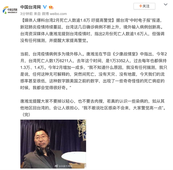 據台灣“中時電子報”報道,新冠肺炎疫情持續蔓延,台灣這幾日確診病例不斷上升,境外輸入病例創新高。台灣資深媒體人唐湘龍提到台灣疫情時,指出2月份死亡人數逾1.6萬人,但強調沒有任何揣測,並提醒大家提高警覺。
