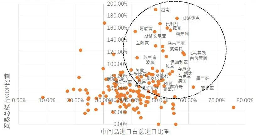 我們計算了世界各國中間品進口額佔總進口額的比重、從中國進口的中間品佔其全部中間品進口的比重以及各國貿易總額佔GDP的比重。如果一國的前兩個指標比較高,則説明該國對中國的中間品進口有較高的依賴度。在此基礎上,若該國同時擁有較高的對外貿易依存度,則説明該國的整體經濟對中國進口的依賴程度更高,進而表明該國在此次新冠疫情中會受到較大沖擊。