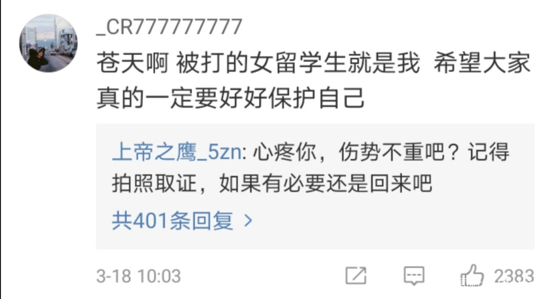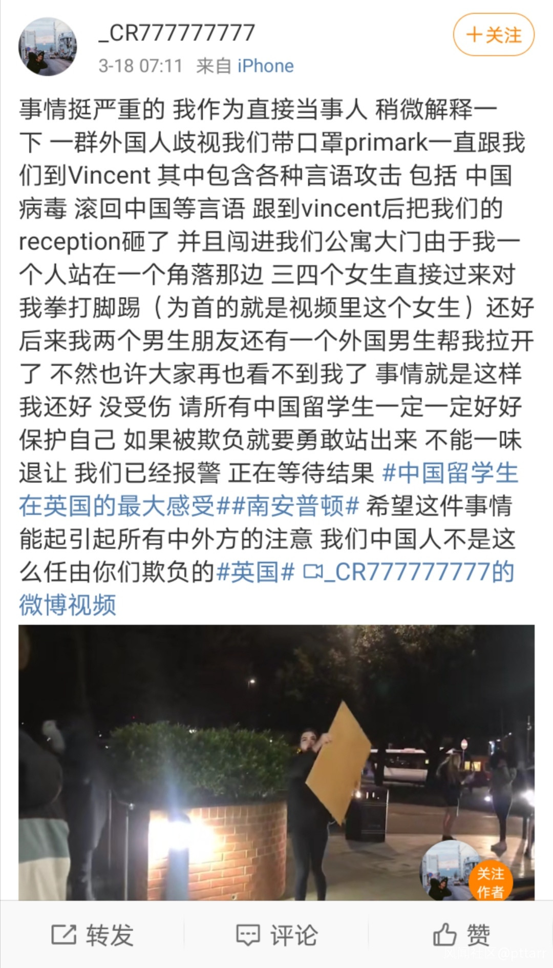 華人留學生想錄視頻時,對方就開始擋臉尖叫,而後,@_CR777777777 因為拍到了一名手持紙板的女生,遭到了對方的報復,被三四名英國女生圍攻,拳打腳踢。而後被兩名中國男生和一名其他國家男同學拉開。