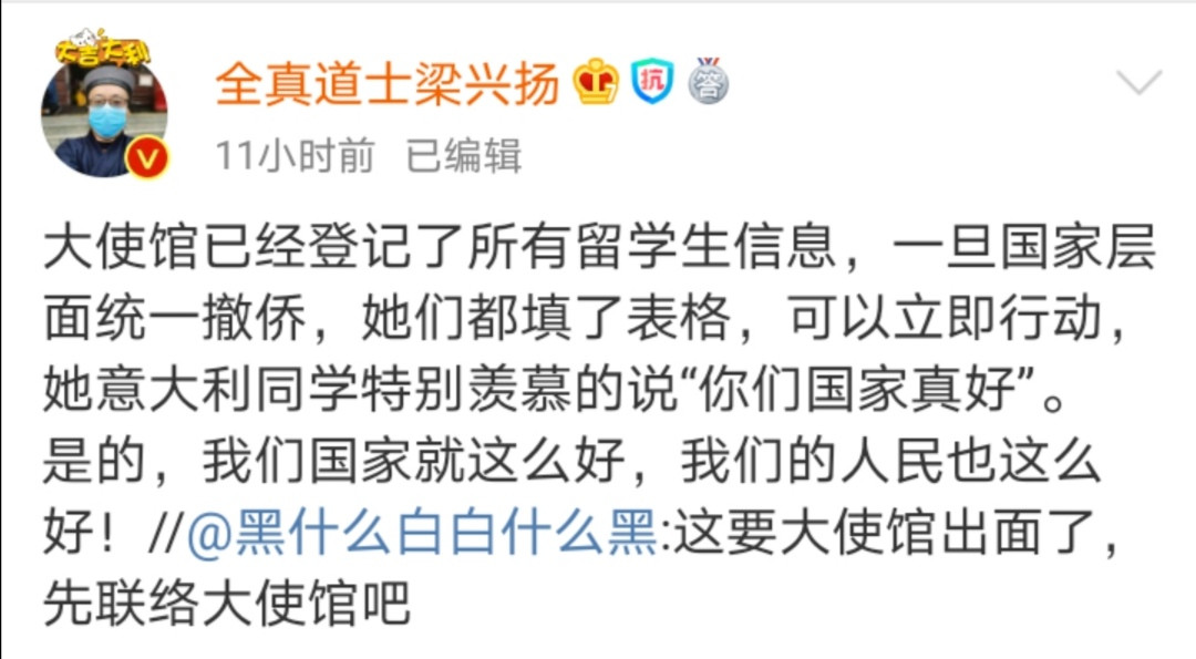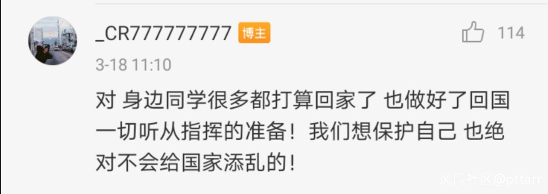 @_CR777777777 説,自己及所在公寓內認識的約三十名留學生一致認為現在回國,給國家內部壓力太大了,現在基本全是從外國帶的(輸入型病例),他們也知道網絡上有不少罵聲,所以不打算回國。