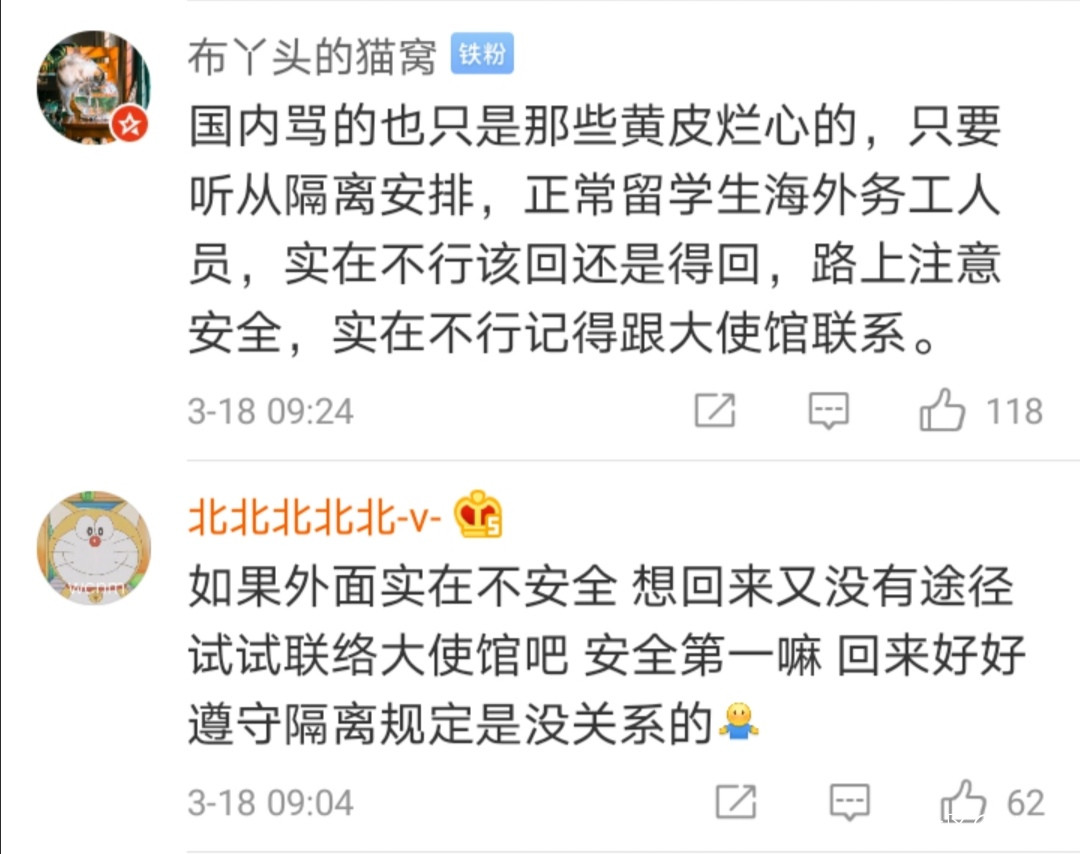 得知@_CR777777777 的遭遇後,網友們紛紛表示:罵聲不是針對你們,好好遵守隔離規定就行,該回還是回來吧。