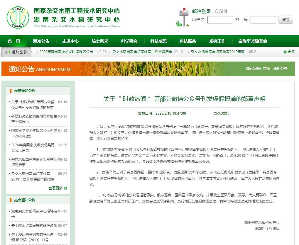 3月10日,國家雜交水稻工程技術研究中心 - 湖南雜交水稻研究中心在其官網發佈《關於“時政熱聞”等部分微信公眾號刊發虛假報道的鄭重聲明》,引發輿論關切。