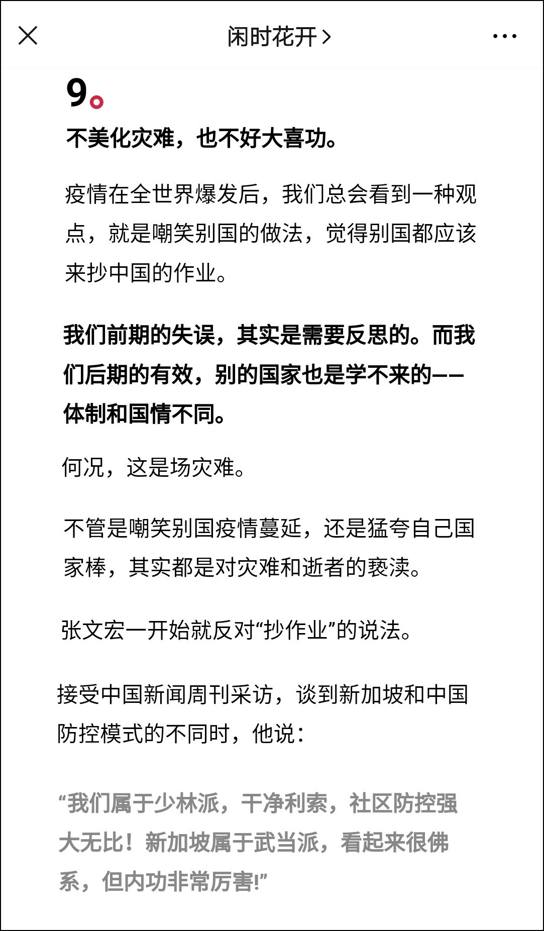 張文宏醫生説,“我們屬於少林派,乾淨利索,社區防控強大無比!新加坡屬於武當派,看起來很佛系,但內容非常厲害!”