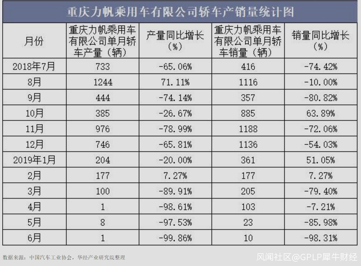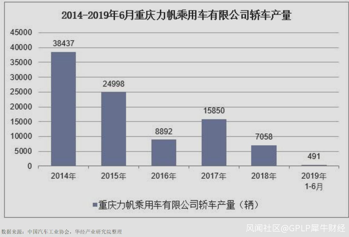 從2014年開始,力帆汽車產銷量就已連年下跌,2018年力帆汽車產量7058輛,與2014年相比下跌82%,截至2019年4月和6月,均僅僅生產1輛。
