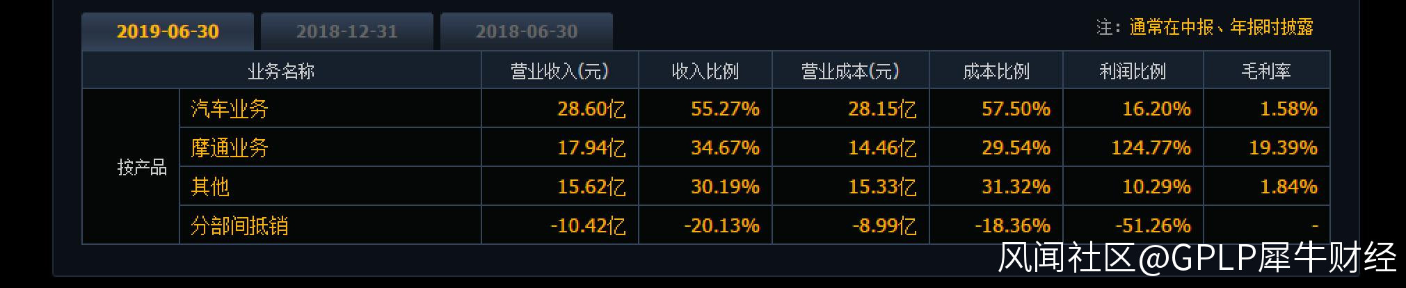 乘用車業務是力帆股份營收的最主要來源,2019年上半年,汽車業務貢獻營收28.60億元,收入佔比高達55.27%。力帆股份起家的摩通業務營收只有17.94億元,收入佔比只有30.19%,利潤佔比卻高達124.77%,依然是其“利潤奶牛”。