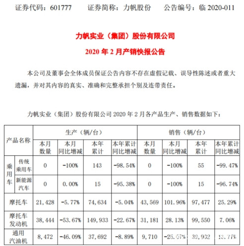 3月13日,力帆股份(601777.SH)發佈2020年2月產銷快報公告。公告顯示,整個2月力帆乘用車產銷數量均為0,同比下滑100%。