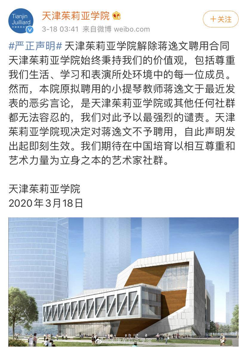 今天(18日)凌晨3時許,天津茱莉亞學院在官方微博發佈嚴正聲明宣佈解除蔣逸文聘用合同。