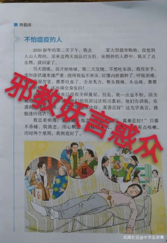 邪教宣傳品稱,一無名氏染疾,念“九字真言——法輪大法好,真善忍好”兩天,症狀消失。這就是邪教“法輪功”編造的所謂“神蹟”。