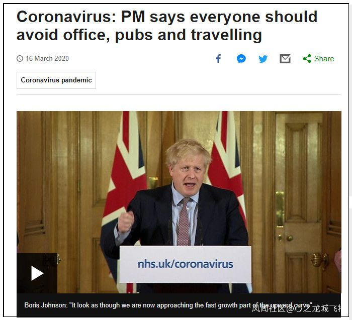 據BBC新聞16日報道,英國首相約翰遜呼籲民眾儘量在家工作、減少外出。