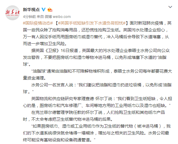 1【#英國手紙短缺引發下水道負荷擔憂#】面對新冠肺炎疫情,英國一些民眾除了搶購消毒用品,還恐慌性搶購衞生紙。英國污水處理企業擔心,萬一有人因沒手紙而用廚房紙巾或濕巾替代,衝入馬桶後會導致下水道堵塞,從而進一步增加衞生風險。