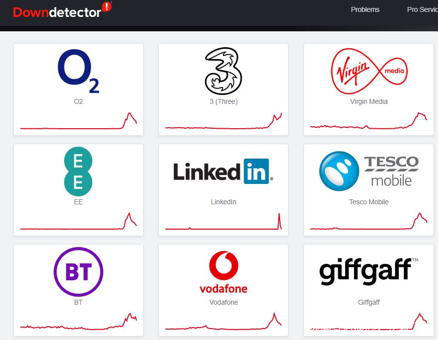 各大運營商報錯數據不斷上升,圖源:“Down Detector”網站
