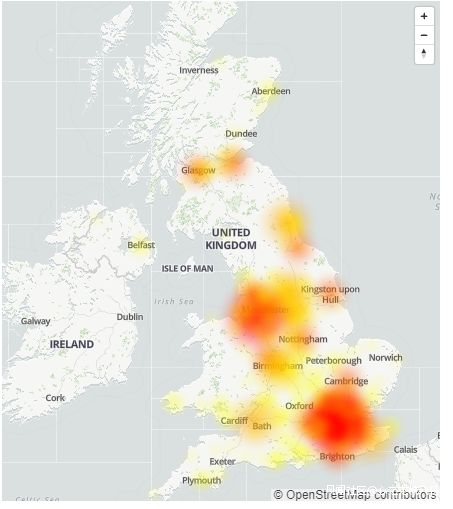 從報錯數據地圖看,目前故障多發地點主要在倫敦市、英格蘭西北部地區。截至目前,報錯數據開始陸續下降,但尚未完全解決。