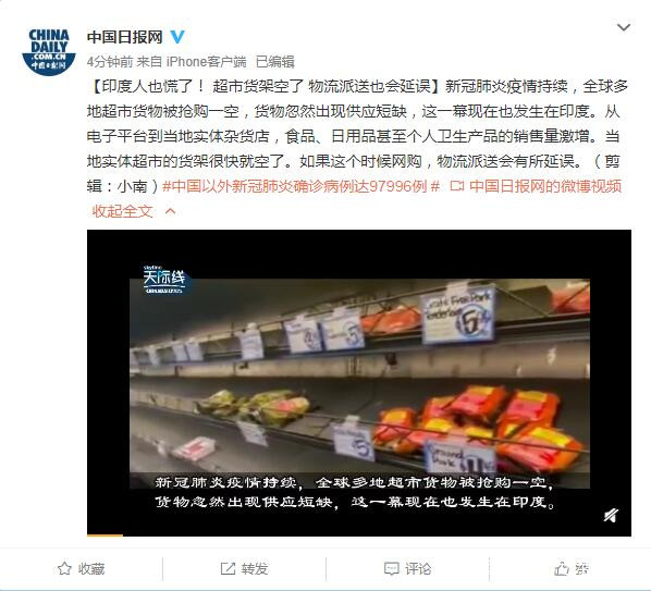 印度人也慌了! 超市貨架空了 物流派送也會延誤來源:中國日報網微博