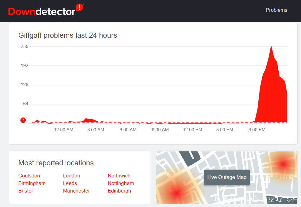 Giffgaff公司的故障情況,圖源:“Down Detector”網站