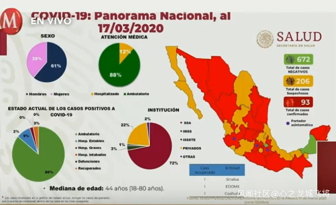 墨西哥當地時間3月17日,墨西哥衞生部宣佈,截止到墨西哥當地時間3月17日晚上7點,墨西哥全國確診93例新冠肺炎病例,較前一天新增了11例,另外還有206例疑似病例,而此前已經排除的疑似病例已經累計到672例。