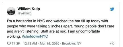 在沒有任何正式禁令的情況下,直到週六晚上,紐約城中許多地方的酒吧和餐館仍然相當擁擠,這增加了冠狀病毒繼續迅速傳播的風險。許多當地人和遊客照常過着自己的生活,他們選擇在擁擠的酒吧慶祝生日,在朋克表演中與汗流浹背的陌生人跳舞,甚至還舉辦了一個以病毒為主題的派對。