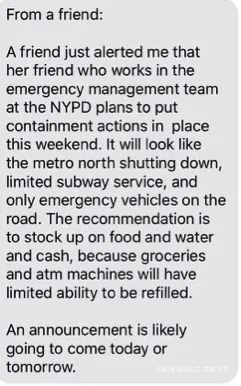上週四下午,在紐約專業人士中流傳的短信和電子郵件警告説,或許是時候離開了,這座城市可能在週五早上或週末被封鎖。其中一條寫道:“一位朋友剛剛通知我,她在紐約警察局應急管理團隊工作的朋友計劃在本週末採取遏制措施。”