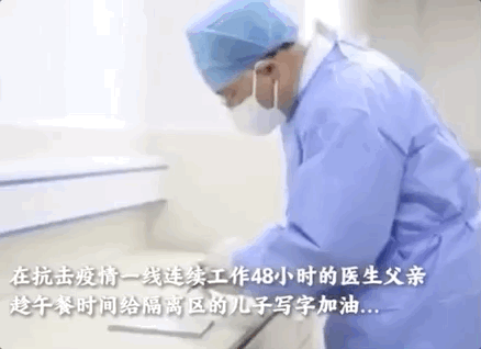 在抗擊疫情一線連續工作48小時的醫生父親,趁着午餐時間給隔離區的兒子寫字加油。