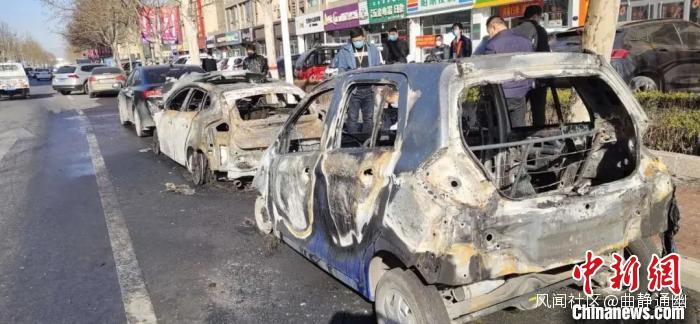 現場7輛轎車被引燃,損毀嚴重。邢台市公安局供圖