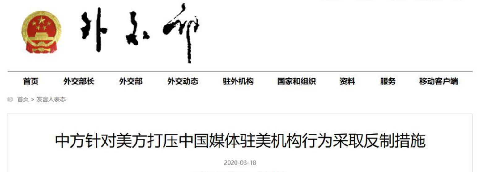 中國外交部官網訊 3月18日凌晨中方宣佈:針對美方打壓中國媒體駐美機構行為採取反制措施。