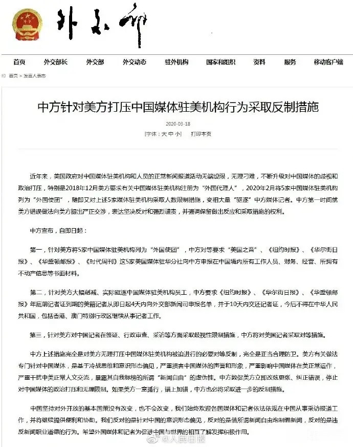3月18日,中國外交部網站發表題為《中方針對美方打壓中國媒體駐美機構行為採取反制措施》的文章。