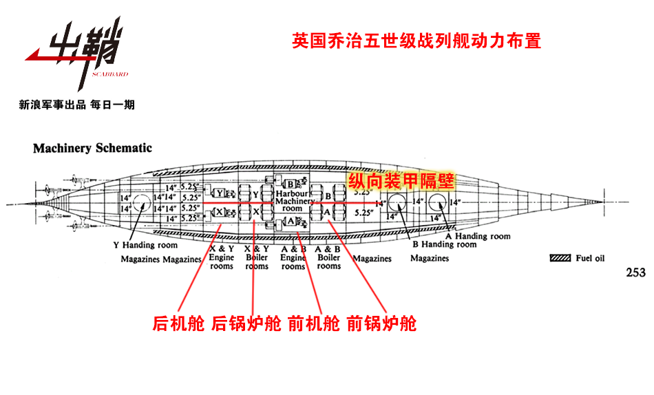 在20世紀10年代之後,魚雷開始加裝陀螺儀,成為了一種較為可靠的武器。這種破壞力極大的武器很容易在艦體上打開一個長達數米甚至十幾米的破洞。這就意味着兩個乃至三個前後相鄰的艙室很容易同時進水。而一旦相鄰的鍋爐艙全部進水,艦艇會直接喪失一半的動力。因此,後來的無畏艦大多把4台主機兩兩一組與鍋爐艙交錯佈置,形成了蒸汽動力艦艇最經典的鍋爐-輪機-鍋爐-輪機交錯佈置方式。我們熟知的包括英國喬治五世級、法國黎塞留級、意大利維內託級戰列艦在內的大量蒸汽動力艦艇均採用了此種構型。