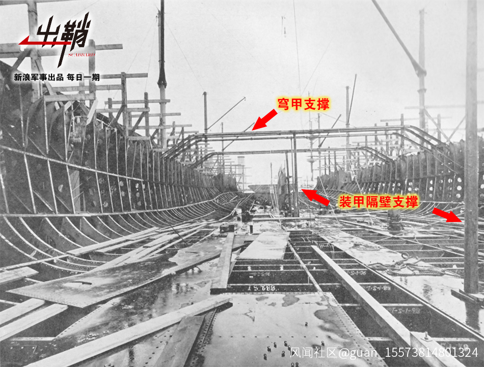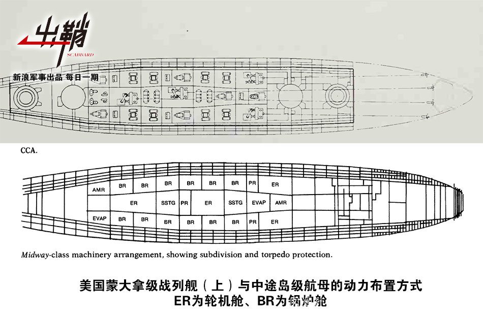 當然,沒有縱向裝甲隔壁的艦艇在面對魚雷攻擊時一定會進更多的水,這對艦艇的抗沉性是極為不利的。因此,是否要採用這種動力佈局還是一件見仁見智的事情。在取消了“通過巴拿馬運河”的限制後,美國戰列艦也得以在寬度上放飛自我。因此美國在二戰中設計的最後一級戰列艦——蒙大拿級就用回了與俾斯麥級、大和級一樣的多縱向裝甲隔壁的船體設計。後來,參考了蒙大拿級戰列艦船體設計的中途島級航空母艦也繼續沿用了類似的設計。