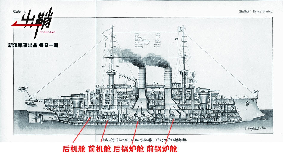 不過類似的佈局在艦船發展史上也僅僅是曇花一現,中軸佈置的鍋爐佔用的長度實在是有點長。因此,在艦艇進一步大型化、寬度足夠之後,鍋爐往往會分成左舷、右舷兩個獨立的部分並列排布。其中最典型的就是英國的無畏級戰列艦。該級艦共安裝了18台鍋爐,每3台一組安裝在6個鍋爐艙中,每兩個鍋爐艙又並列排布在艦艇的同一艙段內。除了能用更短的艦體長度容納更多的鍋爐以外,左右兩舷鍋爐艙、主機艙分隔佈置的另一個好處是,當某一舷的動力艙被擊毀後,兩個艙室中間的裝甲隔壁可以防止進水或爆炸破片進入與其相鄰的動力艙室,這可以儘可能的保證每一次攻擊對艦艇動力系統的破壞最小化。