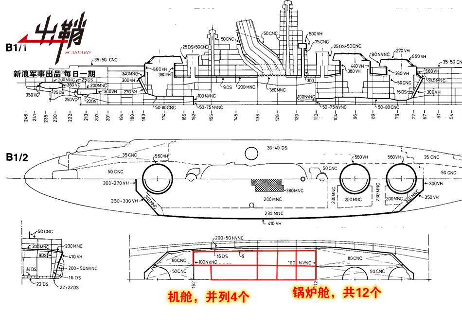 拋開諾夫哥羅德這個怪胎不談,通常艦艇的基數軸系和偶數軸系還是有很大區別的。眾所周知,艦艇需要依靠貫穿其中軸線的龍骨承受艦體的應力,而奇數推進軸的艦艇又幾乎必然會有一條推進軸需要在龍骨上“打洞”。這無疑會導致艦艇的縱向強度受到影響。因此,除了德國建造的戰列艦以外,包括德國戰列巡洋艦在內的世界各國主力艦艇一般都會採用兩軸或四軸推進。
