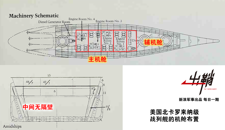 但也有那麼一個怪點子極多的國家選擇了一條未曾設想的道路,這個國家就是上文我們説的那個當時連機械傳動都造不好的美國。在1930年代開始設計的北卡羅來納級戰列艦上,美國人開創了一種改進型的交錯式動力佈局。在這種動力佈局中,艦艇的動力段總共被劃分為了5個艙段。除去前方第一個用於安裝輔助柴油機的艙室外,後4個艙室均對稱安裝了兩台鍋爐和一台蒸汽輪機。這意味着這種動力佈局不需要安裝縱向裝甲隔板即可達到其他安裝了縱向隔板的艦艇的抗損效能。自北卡羅來納級開始,美軍南達科他級戰列艦、衣阿華級戰列艦也都採用了類似的交錯佈置。其中衣阿華級戰列艦由於體型修長,還得以更進一步,將原本並列的鍋爐和主機前後拉開了一個身位的距離,並用橫向裝甲隔壁進一步分割,使動力系統的抗損能力更進一步。