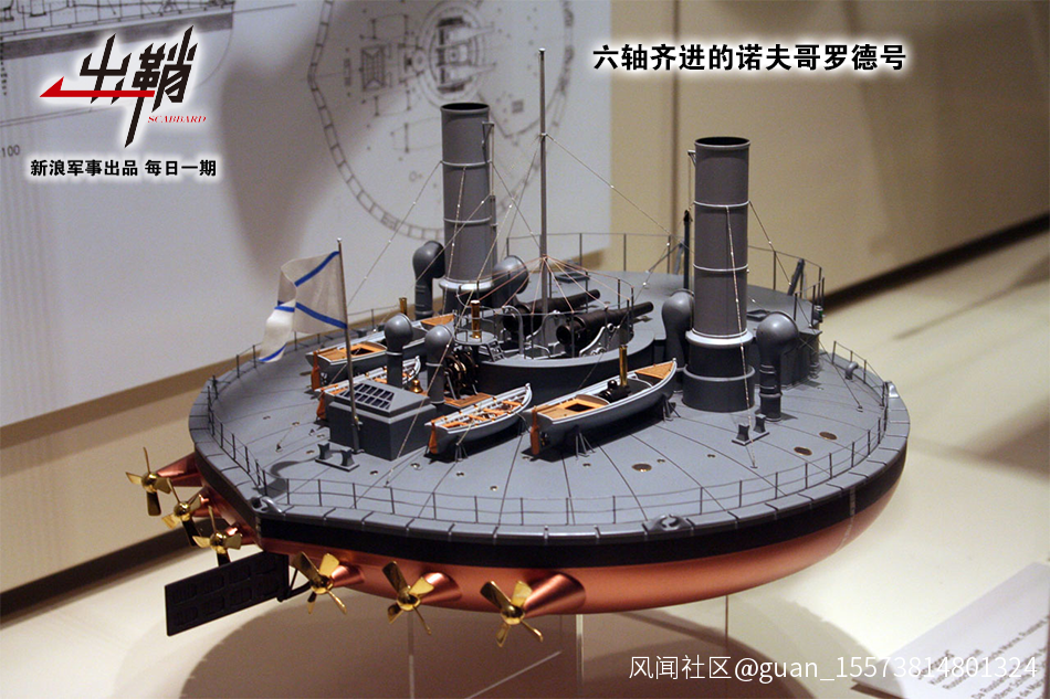在推進軸的佈局上,艦艇通常分為奇數軸和偶數軸兩種,奇數軸通常為單軸或三軸,偶數軸通常為雙軸或四軸。由於單軸推進效率有限,所以對於大噸位的艦艇來説推進軸自然是越多越好。但艦艇寬度又是有限的,所以一般艦艇很難安裝多於4個推進軸。當然,凡事總有例外,有一些不怎麼需要在乎寬度的船,還是可以安裝超過4個推進軸的,比如俄羅斯帝國的諾夫哥羅德級岸防炮艦。由於該級艦採用了超常規的圓形構型,長寬比接近1:1,因此可以在短胖的艦體上安裝6個推進軸,實現六槳齊進。