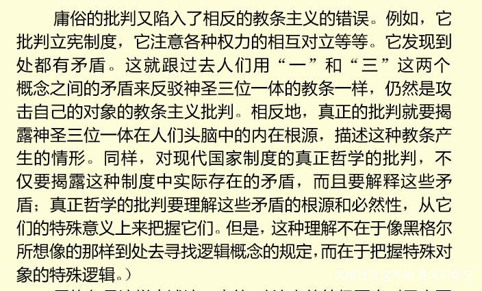 因此,如果我們的批判依然重複於尋找法律規定內的不合理,概念模糊,甚至相互矛盾的地方的時候,我們不僅僅是在越俎代庖地代替了專業人士地工作(而且就效果而言我們並不能比他們做得更好),同樣也是重複着教條主義地錯誤。而真正的批判在於我們需要了解法律根本的譜系(Genealogie),在感性的,特殊的人的社會活動那個之中瞭解到,法與現實存在的真實情況的矛盾到底是怎麼產生的。