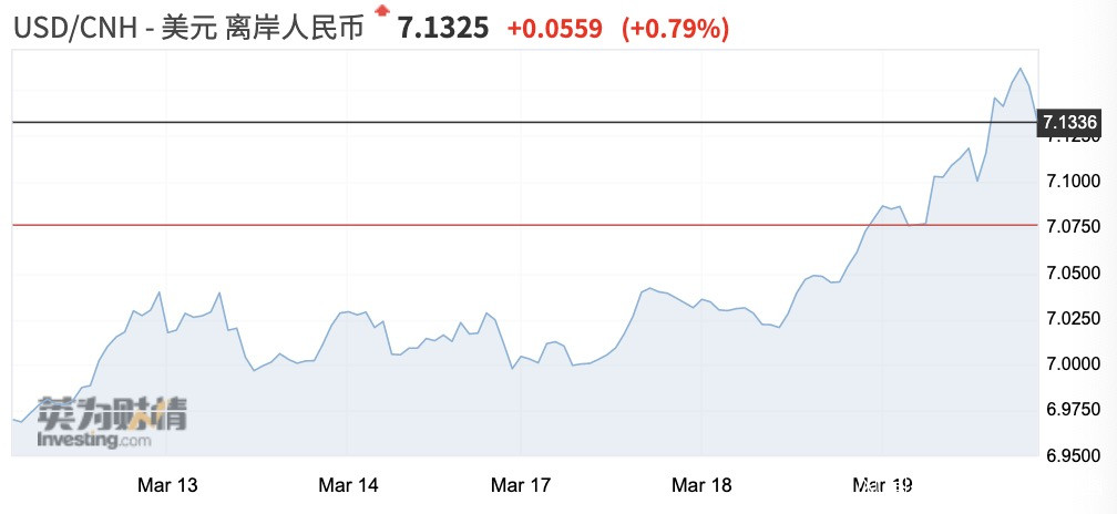 3月19日,人民幣對美元中間價調貶194點,報7.0522,離岸人民幣對美元走貶至7.15附近。3月初,人民幣最強至6.92附近。