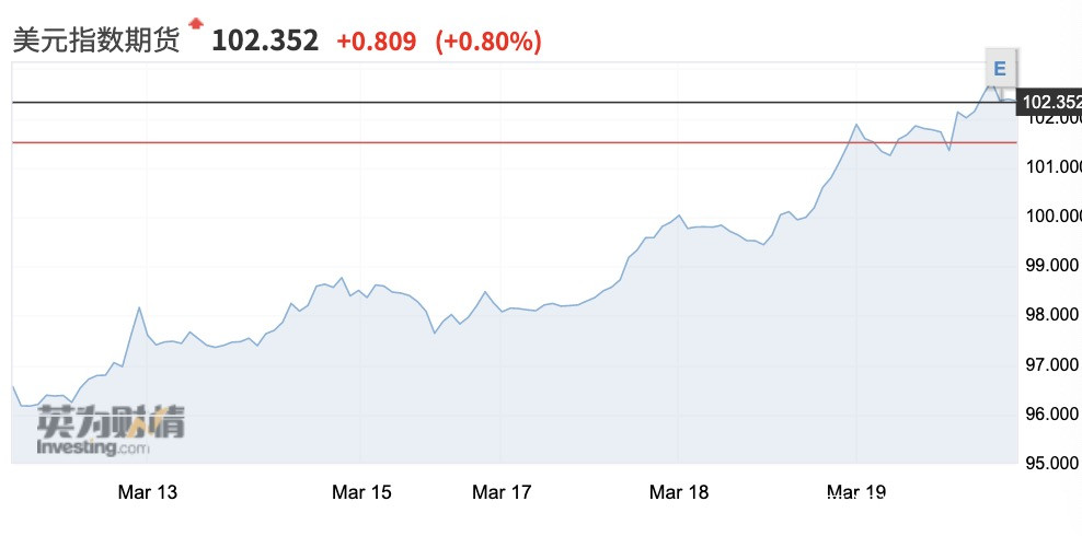 北京時間3月18日20時左右,美元指數時隔四年再度突破100大關,此後迅速攀升,並在19日下午突破102,截至當日晚7時報102.4,突破2016年的最高點,美元當日走強導致澳元、韓元、新西蘭元等匯率市場出現暴跌。週三英鎊對美元一度下跌超過5%,刷新1985年以來的新低至1.1446。